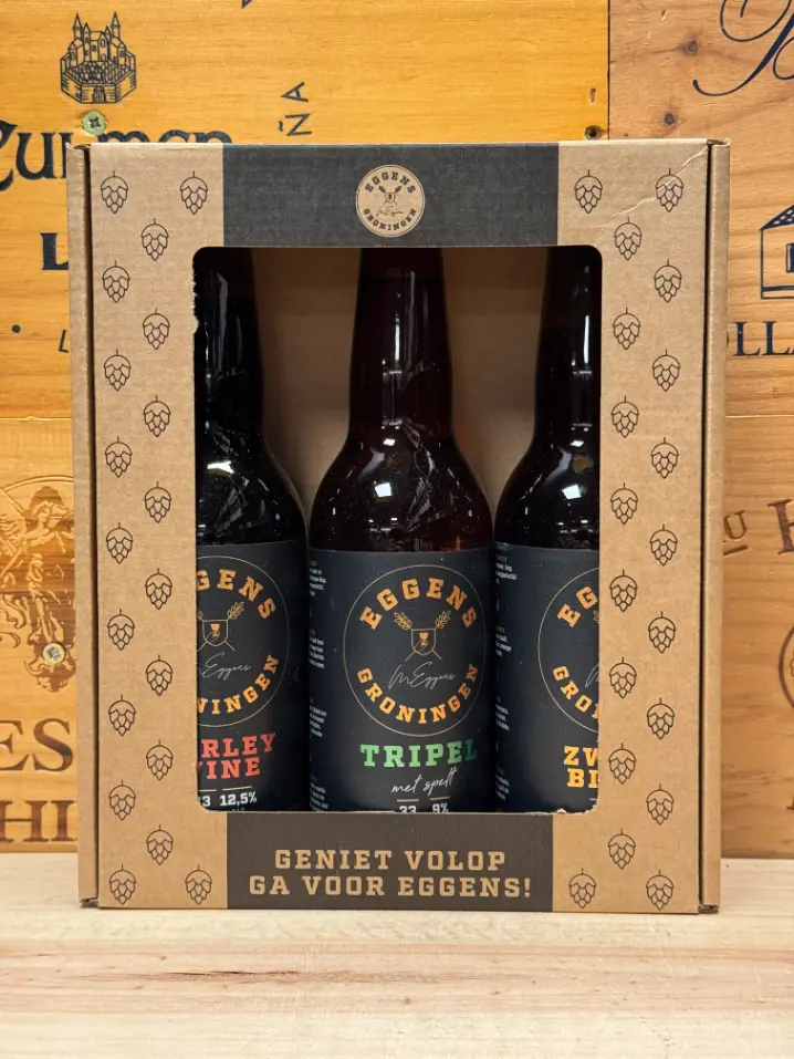 De Eggens Geschenkverpakking 3 Flesjes is een luxe biercadeau van de ambachtelijke brouwers van Eggens Craft Beer uit Groningen. Deze prachtige geschenkset combineert drie krachtige speciaalbieren – Barley Wine, Tripel en Zwaar Blond – in een stijlvolle verpakking die pure klasse uitstraalt. Perfect als cadeau, relatiegeschenk of om zelf te genieten van de rijke smaken en het karakter van een echte Groningse brouwerij. Elk bier weerspiegelt het vakmanschap, de passie en de creativiteit waar Eggens Craft Beer om bekendstaat.