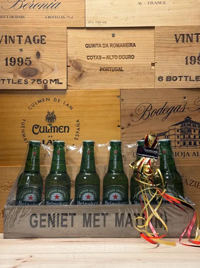 Heineken is wereldwijd een van de bekendste biermerken, gebrouwen met passie sinds 1873. De herkenbare groene fles, de rode ster en het frisse, zuivere karakter maken dit pils tot een favoriet bij velen. In deze geschenkverpakking komen de zes flesjes prachtig tot hun recht: stijlvol, overzichtelijk en met een persoonlijke boodschap die humor en warmte combineert. De houten kist heeft een natuurlijke uitstraling en is stevig genoeg om hergebruikt te worden — als decoratie, bierhouder of om opnieuw te vullen met andere favorieten.
